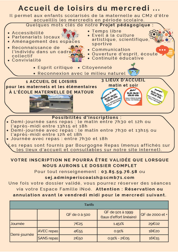 L’accueil de loisirs du mercredi est organisé sur le site de Matour (7h30 -18h) mais des points d'accueils sur Tramayes et Dompierre sont possibles le matin (7h30/8h30) et le soir (17h30/18h00).
